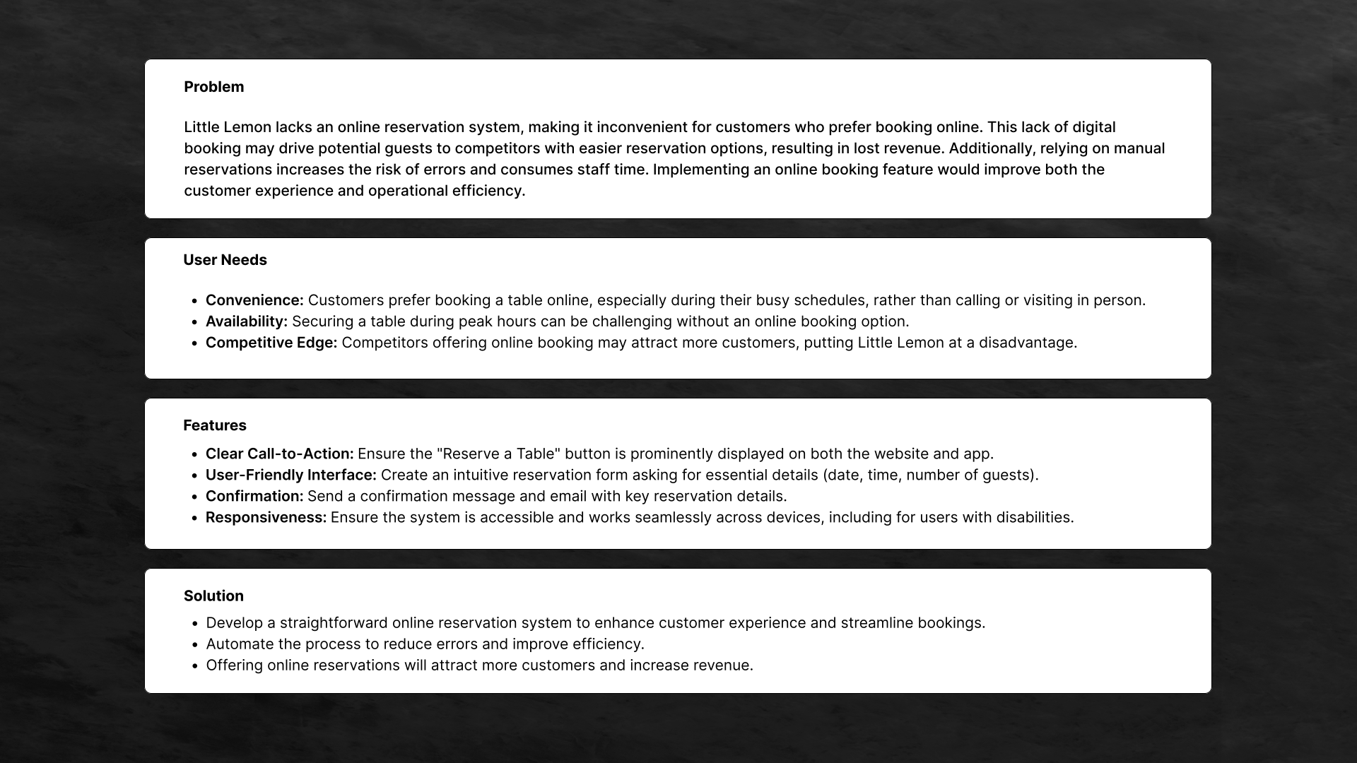 For this peer-graded assignment, I was tasked with designing a Table Reservation Feature for Little Lemon, a fictional restaurant known for offering healthy food options. Little Lemon provides dine-in, takeout, and delivery services through its app, catering especially to busy professionals seeking convenient and nutritious meals.